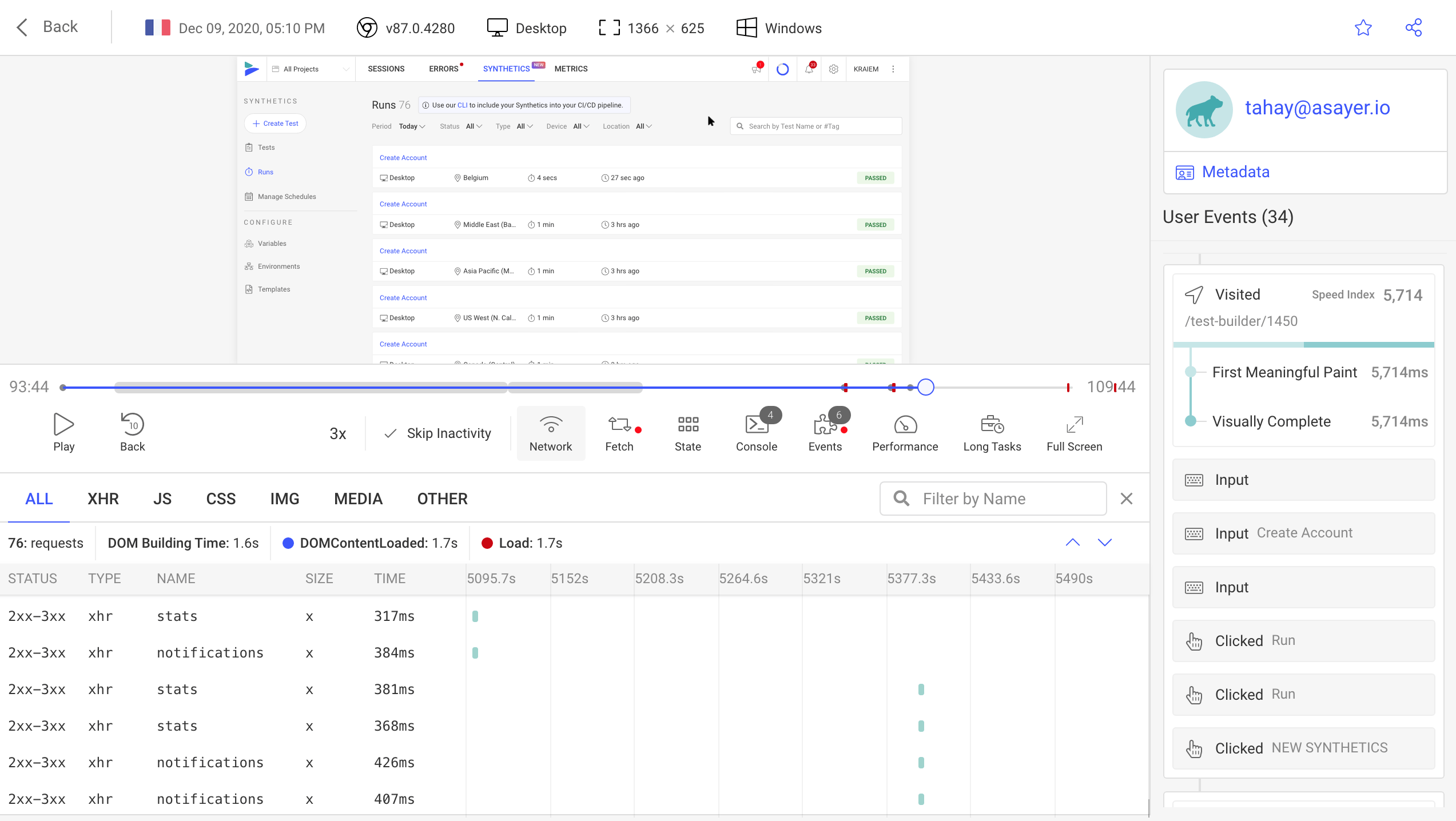 • Session replay: Lets you relive your users' experience, see where they struggle and how it affects their behavior. Each session replay is automatically analyzed based on heuristics, for easy triage.
